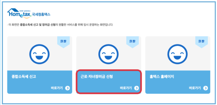 홈텍스 --> 신청,제출 --> 근로,자녀장려금 신청하기 --> 일반신청하기 --> 신청요건 확인